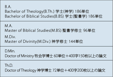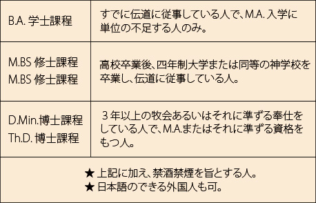 日本校では、日本語による授業と論文(博士課程のみ)によって、米国本校より英文の学位記( Th.D. / D.Min. / M.BS / M.Div. )または称号 (B.A.)が授与されます。入学は春、秋、冬の各学期に可能です。 毎月曜日午前9時~正午の集中授業を10回行い、レポート提出によって学期を終了します。また、Zoom, YouTube, DVDによる通信制があります。